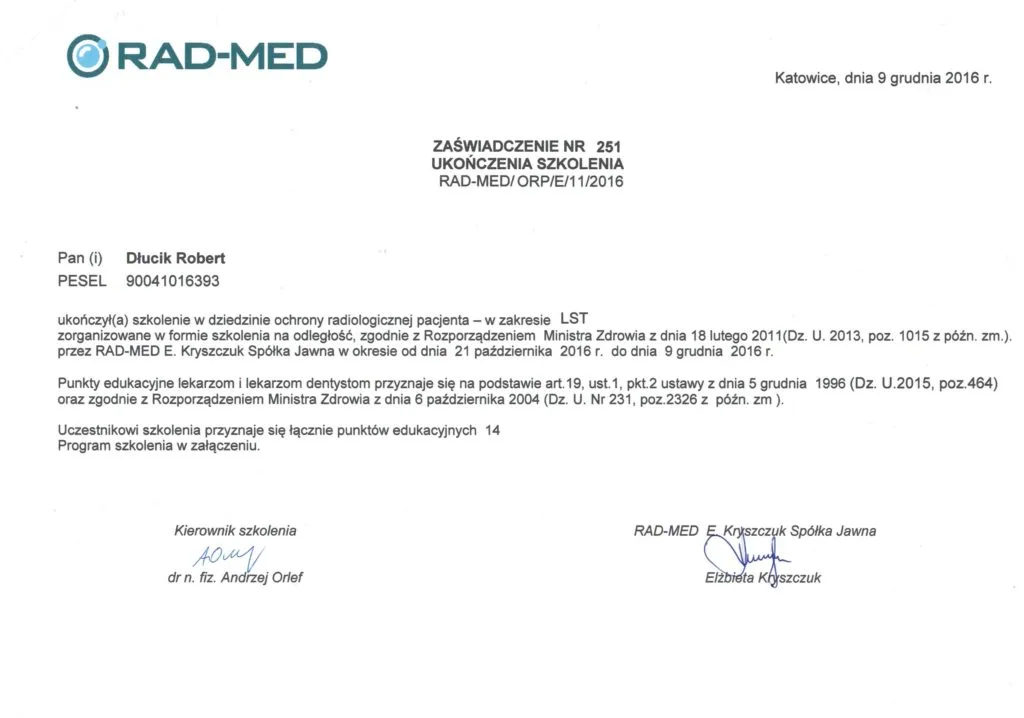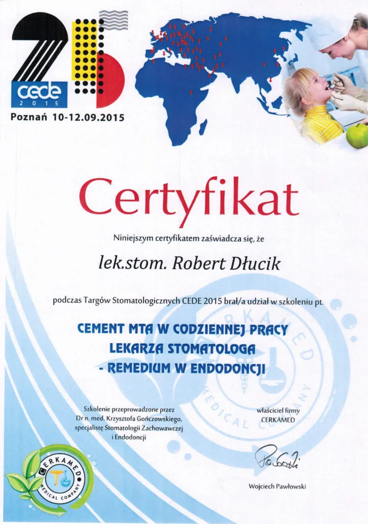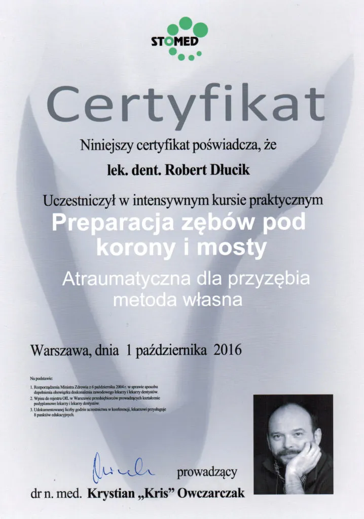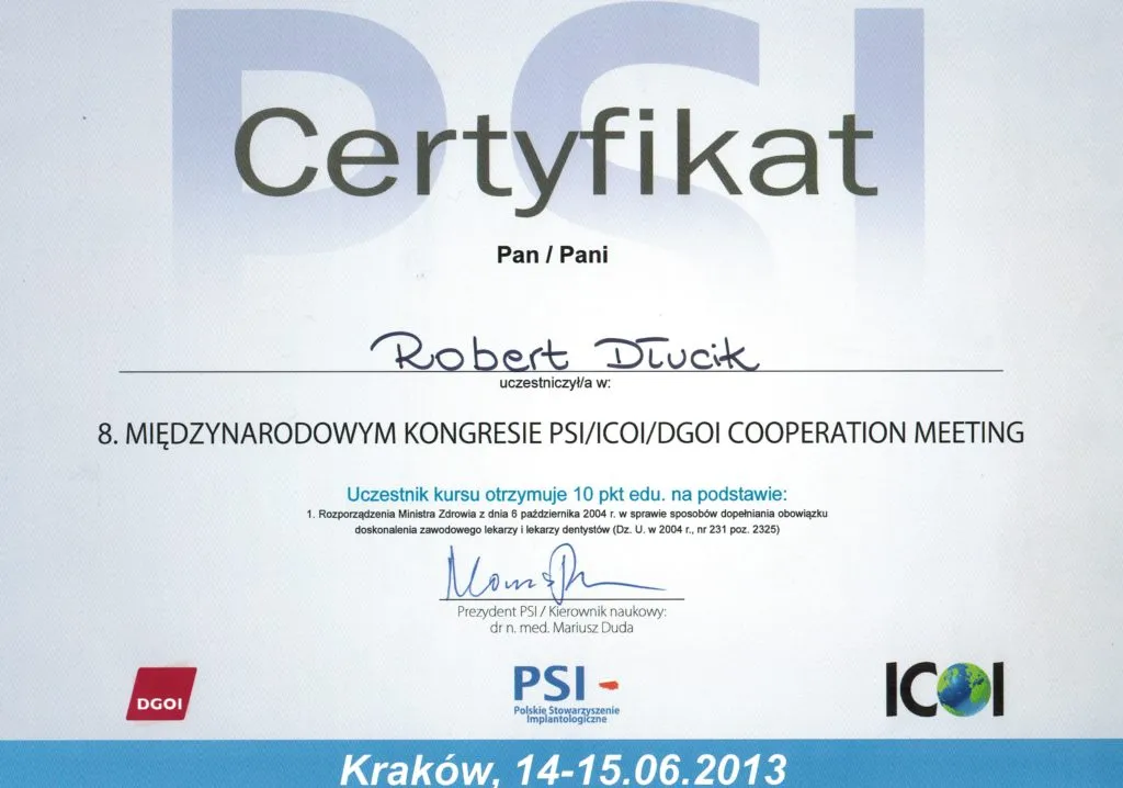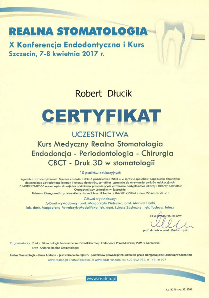 Implantolog, Lekarz dentystaDr n. med. Robert Dłucik lekarz implantolog jest absolwentem Wydziału Lekarsko – Dentystycznego na Uniwersytecie Pavla Jozefa Safarika w Koszycach. Ukończył z wyróżnieniem Curriculum Implantologii i posiada Licencję Praktyki Implantologicznej Polskiego Stowarzyszenia Implantologicznego z afiliacją International Congress of Oral Implantologists – ICOI i New York University College of Dentistry. Od wielu lat jest aktywnym członkiem PSI i ICOI. Za pomyślne zdanie egzaminu fellowship PSI/ICOI otrzymał tytuł „lekarz implantolog”. W 2019 roku dr Robert Dłucik ukończył maraton implantologiczny Trinon Collegium Practicum na Dominikanie.