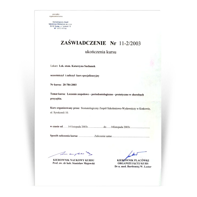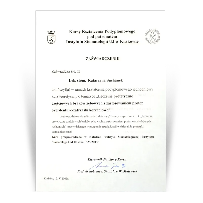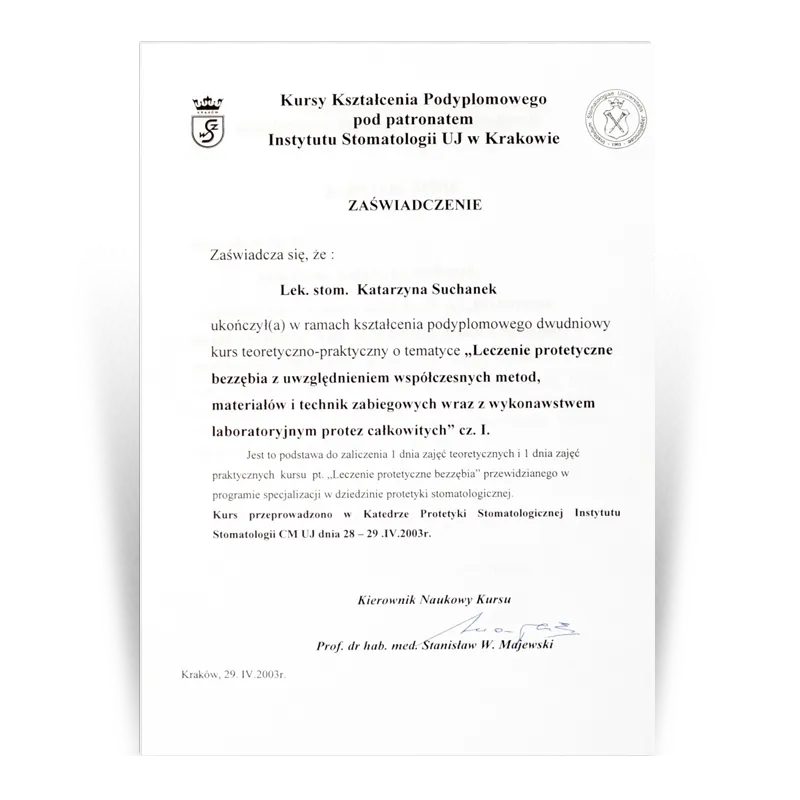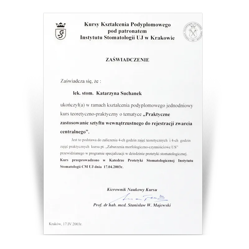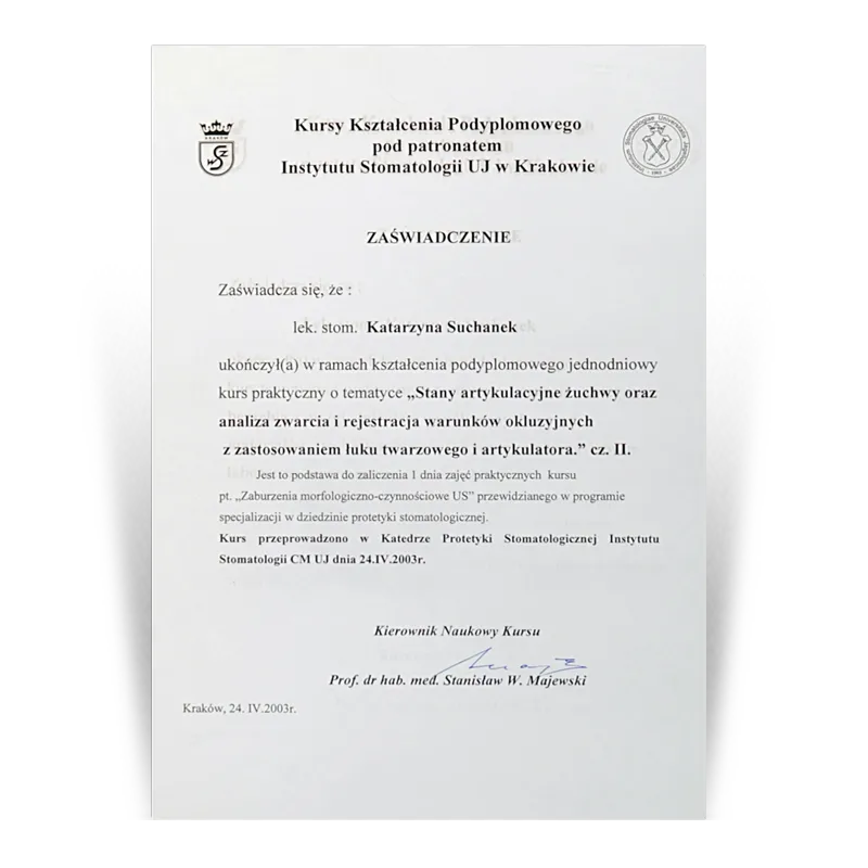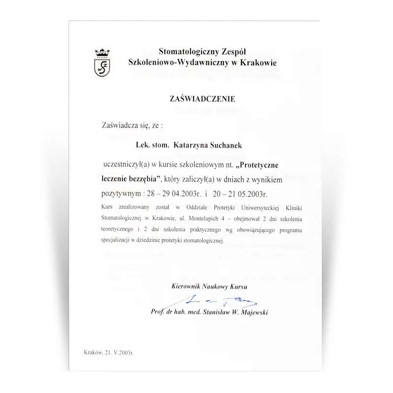 Lekarz dentysta, Specjalista protetykiOd 1993 prowadzi działalność dentystyczną w gabinetach stomatologicznych Dental Team. Po wielu szkoleniach w 2003 uzyskała tytuł Specjalisty Protetyki II stopnia. W ciągu ponad 30 lat pracy zdobyła doświadczenie w różnych dziedzinach stomatologii. Jednak protetyka stomatologiczna to jej pasja, przygoda i wyzwanie. Zebrana latami wiedza i doświadczenie oraz kooperacja z najlepszymi lekarzami w innych dziedzinach stomatologii (endodoncji, chirurgii i implantologii) pozwala jej na zaplanowanie i wykonywanie prac protetycznych zgodnie ze sztuką.